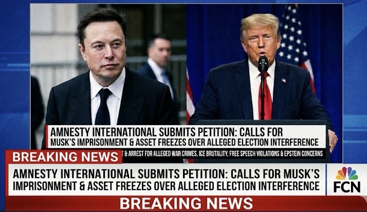 Amnesty International Submits Petition Seeking Possible Imprisonment and Asset Freezes for Elon Musk Over Alleged Foreign Election Interference, Also Calls for Donald Trump’s Impeachment and Arrest, Citing Allegations of War Crimes, ICE Brutality, Free Speech Violations, and Epstein-Related Concern