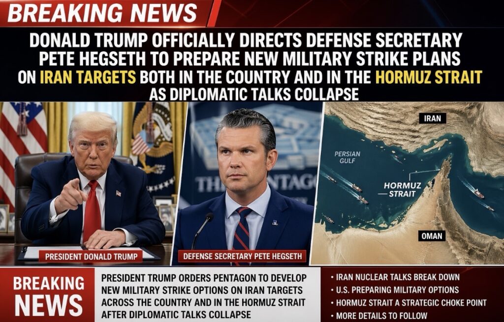Donald Trump Officially Directs Defense Secretary Pete Hegseth to Prepare New Military Strike Plans on Iran Targets both in the country and in the Hormuz Strait as Diplomatic Talks Collapse