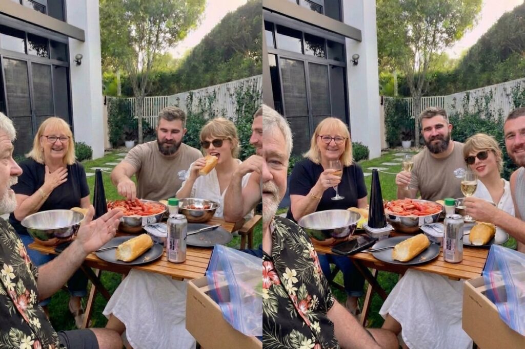 Taylor Swift was recently spotted sharing a relaxed and cheerful afternoon with the Kelce family, as she joined Ed “Papa” Kelce, his ex-wife Donna Kelce, and their sons Jason and Travis Kelce for a casual lunch in Papa Kelce’s garden. The low-key gathering quickly caught fans’ attention, offering a rare and heartwarming glimpse into the close bond forming between the pop superstar and the famous NFL family.