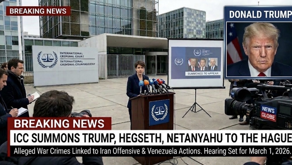 A major international legal storm is unfolding after the International Criminal Court (ICC) in The Hague reportedly issued summons for Donald Trump, Pete Hegseth, and Benjamin Netanyahu to appear before the court for a hearing scheduled for March 1, 2026. The summons comes amid growing international scrutiny over military operations linked to the ongoing conflict in Iran and reported military actions in Venezuela.