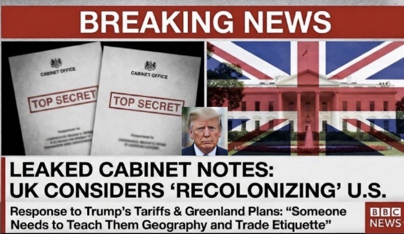 London, January 20, 2026 — In what is being described as “the most bizarre diplomatic development in decades,” leaked documents from the British Cabinet indicate that senior ministers have joked — and in some cases seriously discussed — the possibility of recolonizing the United States. The apparent trigger: former U.S. President Donald Trump’s obsession with Greenland and his repeated threats of punitive tariffs against British goods.