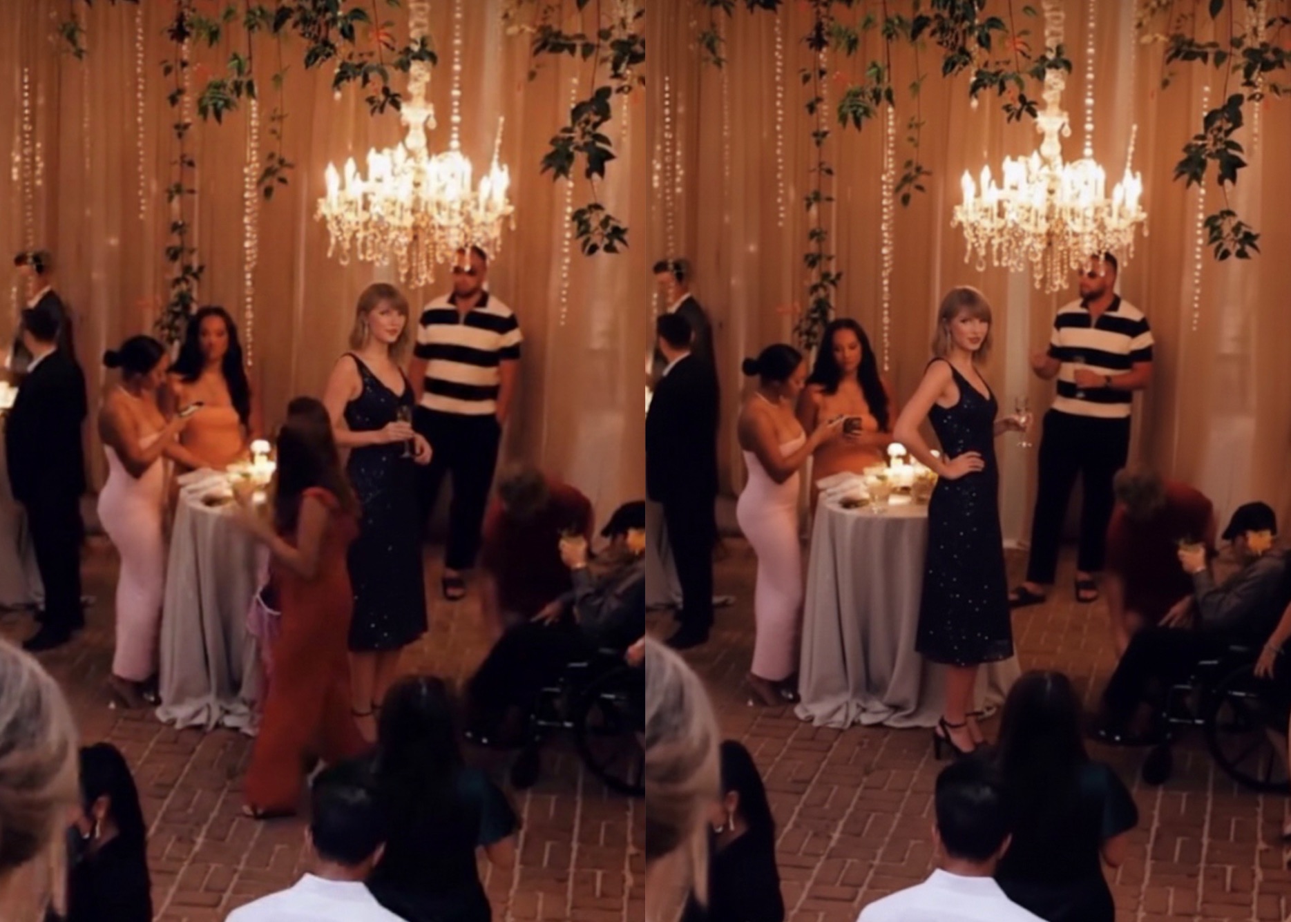 LOS ANGELES, CA – In a scene that could have been plucked straight from a “Love Story” music video, pop superstar Taylor Swift and Kansas City Chiefs tight end Travis Kelce were spotted adding a touch of A-list sparkle to a friend’s wedding after-party over the weekend. The high-profile couple, whose romance has been a whirlwind of “Wildest Dreams” for fans, appeared relaxed and radiant as they mingled with guests under the soft glow of elegant chandeliers.