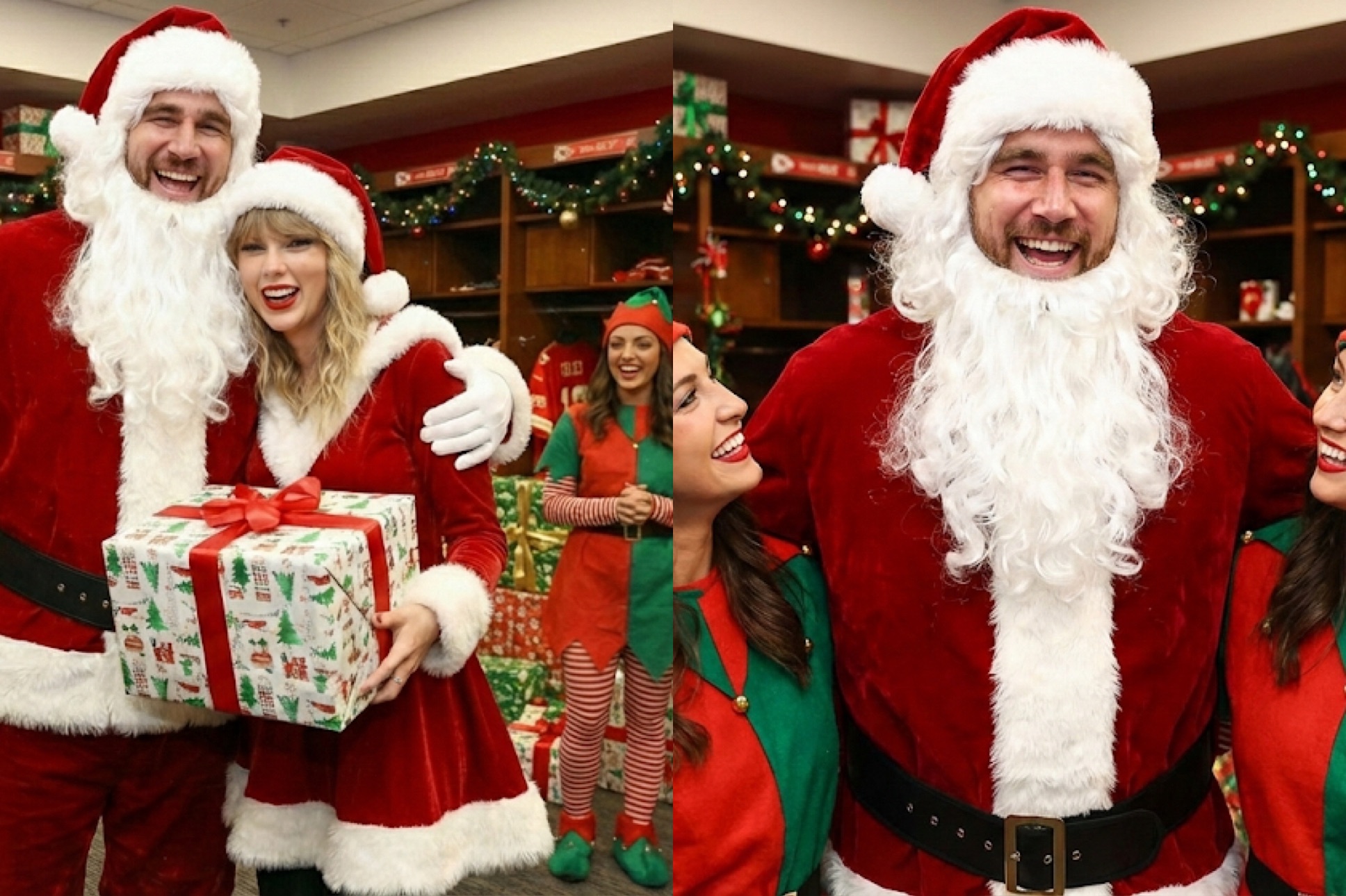 The edited snap shows Swift, dressed as a glamorous Mrs. Claus in a fur-lined red dress, cozied up to Kelce as Santa, his arm wrapped around her while she holds a beautifully wrapped gift. In the background, other partygoers in elf costumes add to the merry atmosphere, with twinkling lights, garlands, and stacked presents evoking the warmth of Chiefs Kingdom’s holiday celebrations. Fans have been quick to dub it the “Merry Swiftmas” portrait of the year, with social media buzzing over the adorable transformation.