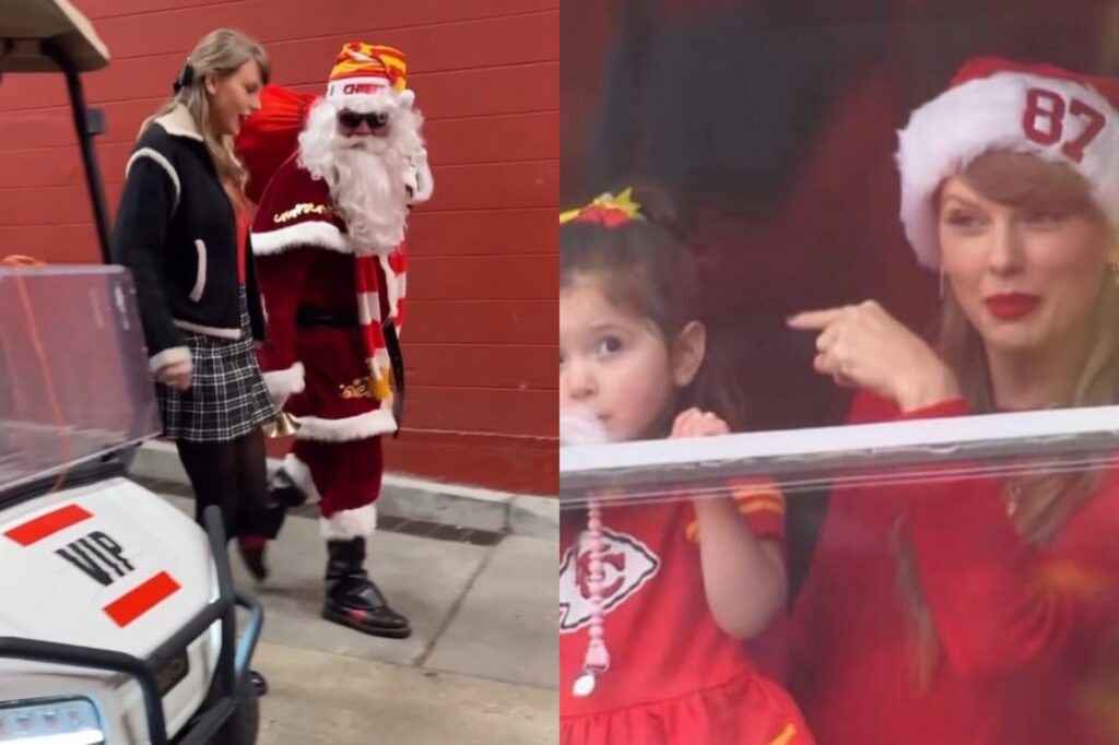Arrowhead Stadium witnessed more than just football during the Chiefs vs. Broncos matchup, as unseen photos circulating online captured Taylor Swift turning game night into a full holiday moment. The global pop superstar arrived at the stadium in unmistakably festive fashion—alongside a Santa Claus figure—instantly sending fans into celebration mode and adding a Christmas glow to the already electric atmosphere.