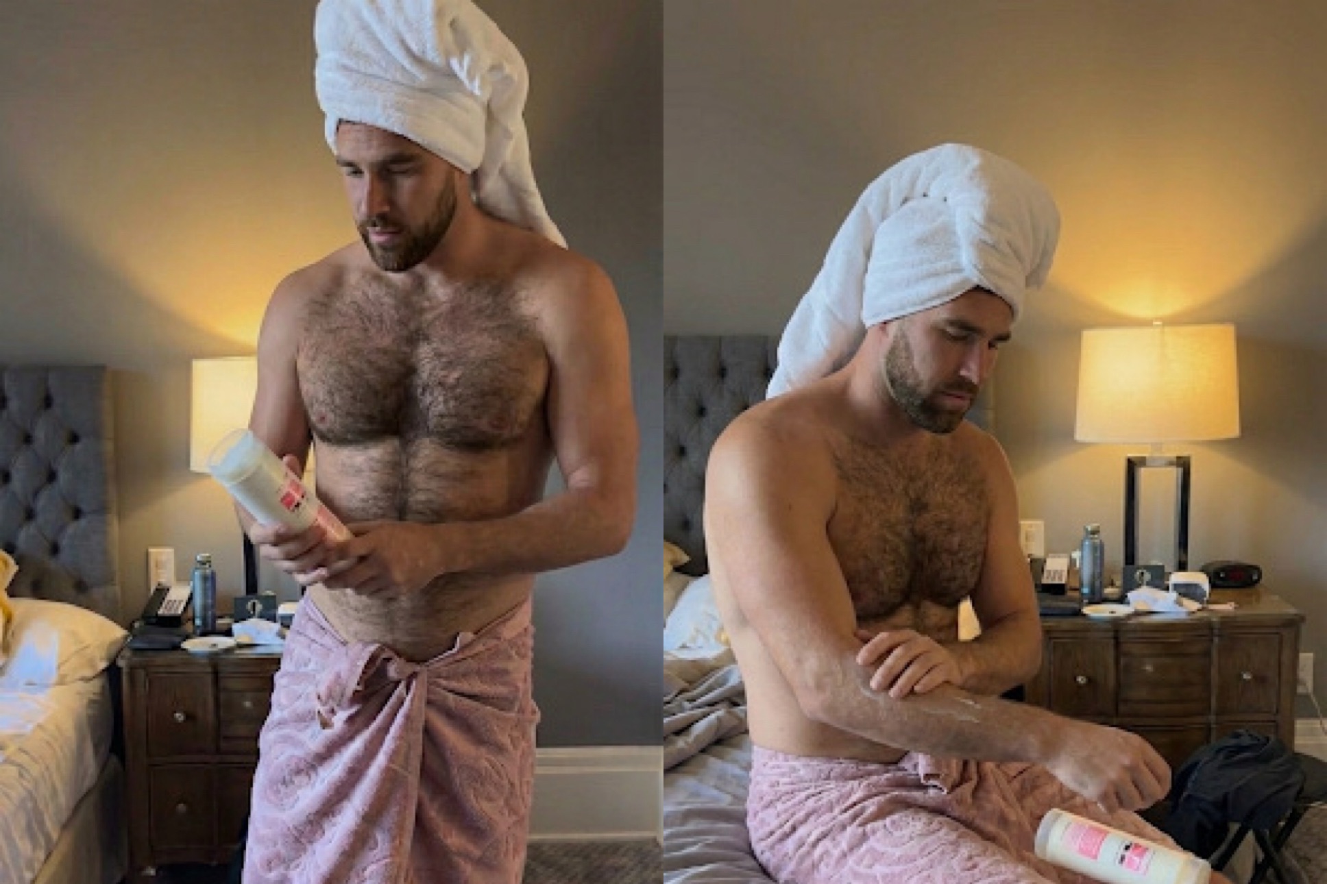 It all started with a simple pair of photos: Kansas City Chiefs tight end Travis Kelce, fresh out of the shower, wrapped in a pink towel around his waist, another towel twisted into a perfect turban on his head, casually applying lotion to his arm in what appears to be a hotel room. The NFL star looks focused, almost serene, as he goes through his post-shower skincare routine like it’s the most normal thing in the world for a 6’4”, 250-pound Super Bowl champion.